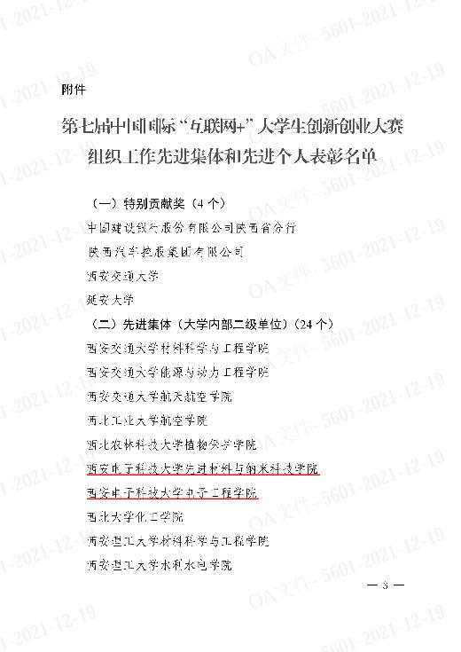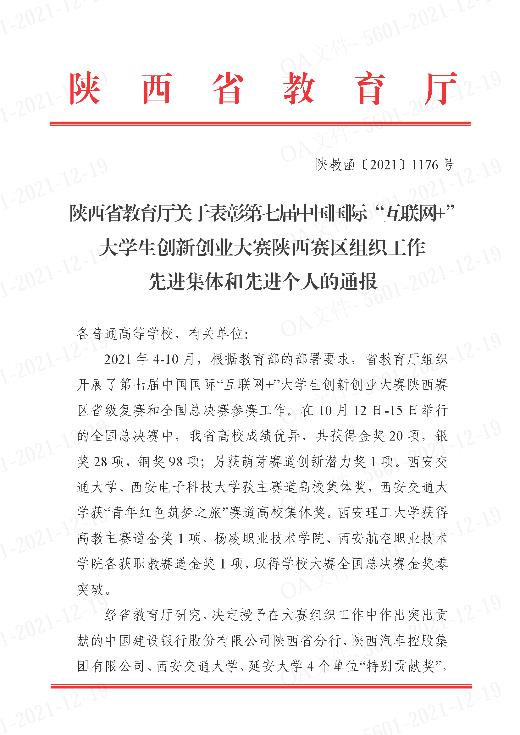 (通讯员 李雨烟 杨峻玮)近日,陕西省教育厅发布《关于表彰第七届中国国际“互联网+”大学生创新创业大赛陕西赛区组织工作先进集体和先进个人的通报》,威尼斯9499登录入口荣获组织工作先进集体。