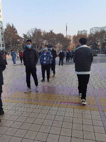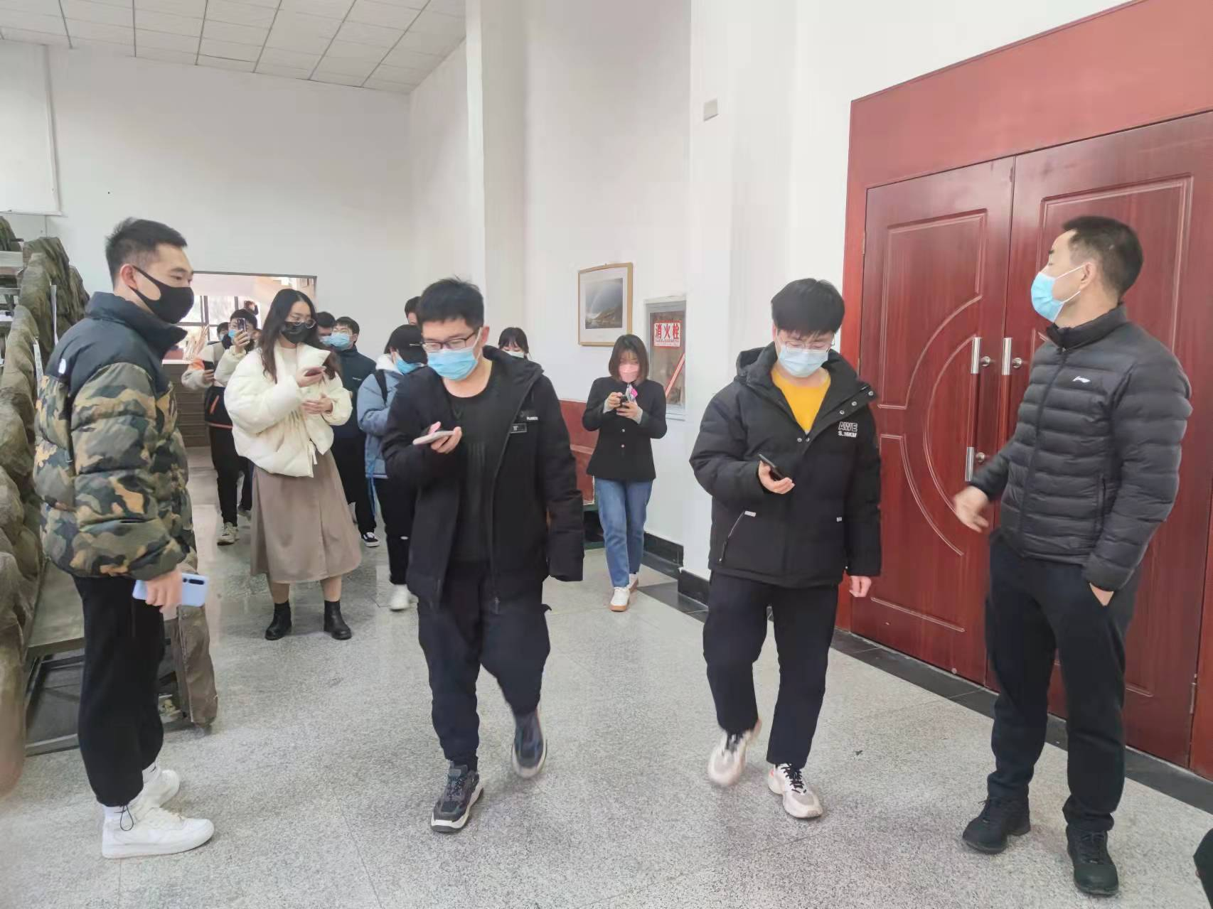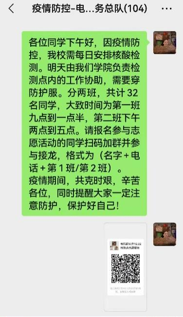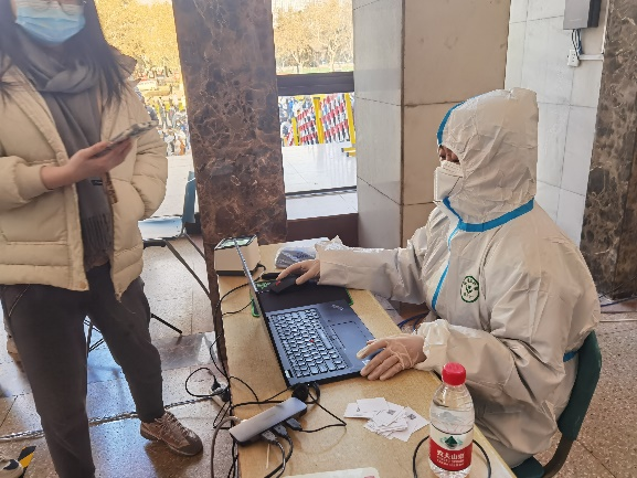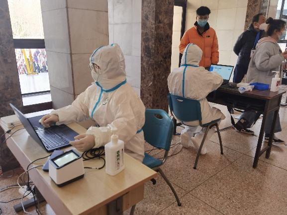志愿者们有的穿上白色防护服成为“大白”,协助医护人员核查数据,有的在排队处引导同学们有序检测。