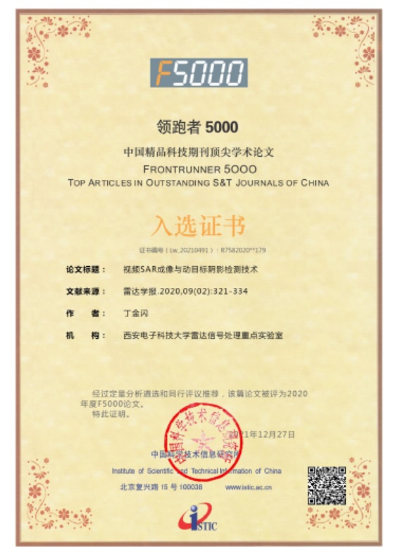 (通讯员 刘昕雨)2021年12月27日,科技部中国科学技术信息研究所发布了2020年度“领跑者5000-中国精品科技期刊顶尖学术论文”(简称F5000)获奖名单,我院丁金闪教授论文《视频SAR成像与动目标阴影检测技术》入选,论文于2020年4月发表在EI检索中文期刊《雷达学报》上。论文提出了视频雷达成像与目标检测技术框架与关键算法,发表以来得到了行业高度评价。