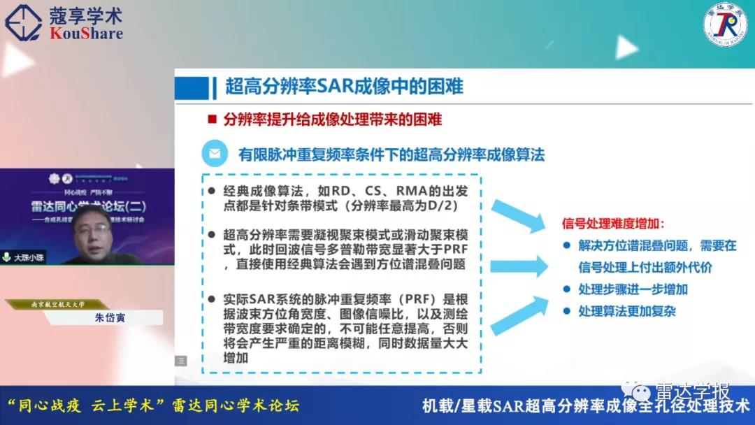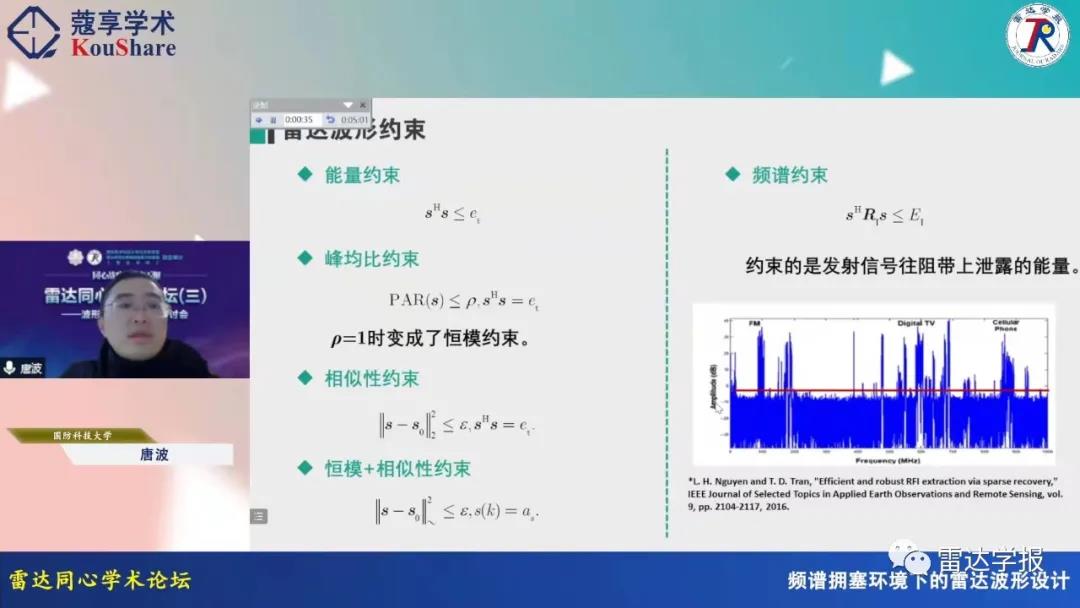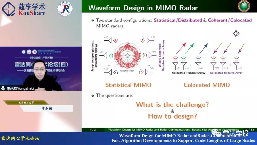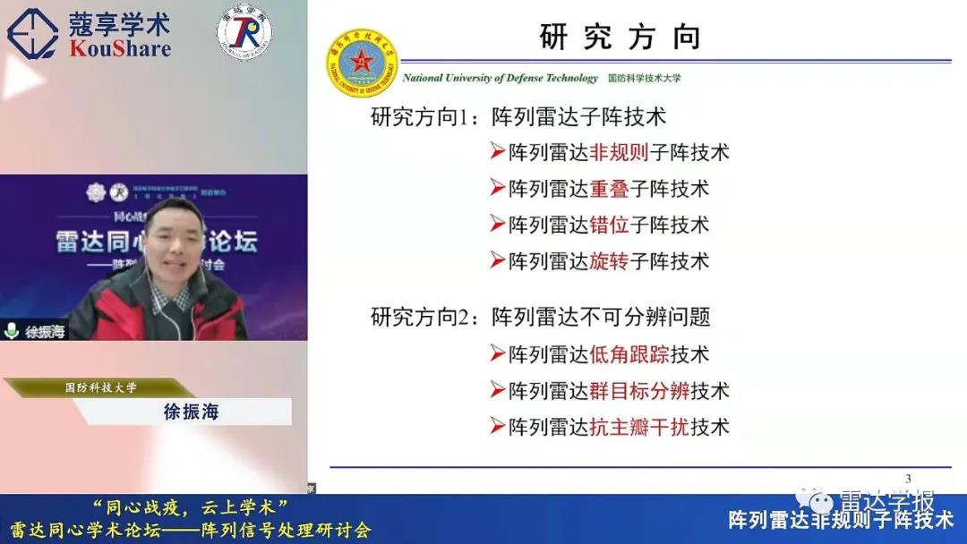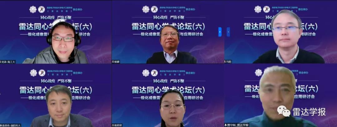 本次论坛主题为“同心战疫,云上学术”,包括7场专题研讨会(阵列信号处理研讨会、合成孔径雷达成像信号处理技术研讨会、波形分集雷达技术研讨会、认知智能雷达探测技术研讨会、雷达目标成像技术研讨会、极化成像雷达目标解译与应用研讨会、网络化雷达协同探测技术研讨会),来自西电、国防科大、电子科大等学术机构的36位专家学者做了精彩的学术报告。