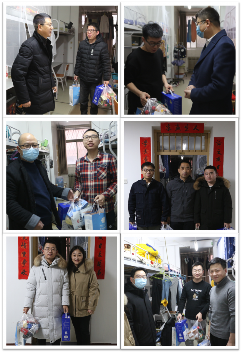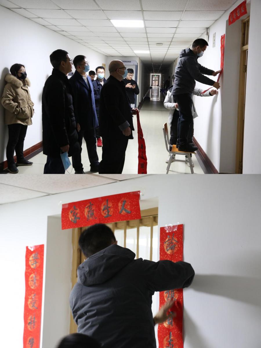 活动中,由学院领导亲自给留校学生发放过年大礼包,走进宿舍慰问学生,了解学生的生活和学习情况,叮嘱学生要和家长保持沟通,让家长放心,学校和学院一定能让大家在校如在家一样快乐,过一个不一样的虎年。此外,学院领导与同学一道,贴上了导师饱含祝福的手写春联,上联“论文项目两开花”、下联“学业爱情双丰收”,横批“人生赢家”,大家在春联下共同合影留念,让远离家乡的学生们感受“家”一般的温暖,体验不一样的春节。