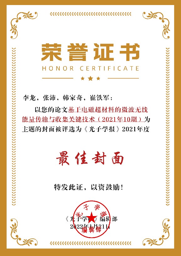 (通讯员 韩家奇)威尼斯9499登录入口李龙教授课题组和东南大学崔铁军院士课题组受邀在《光子学报》“威尼斯9499登录入口90周年校庆”专辑发表了题为《基于电磁超材料的微波无线能量传输与收集关键技术》的综述文章,本文被选为2021年第10期封面论文,本文第一作者为李龙教授,通讯作者为崔铁军院士。近日,《光子学报》公布了2021年度封面论文评选结果,该封面论文荣获最佳封面奖。本次评选活动共评选出最佳封面奖1名,优秀封面奖3名。
