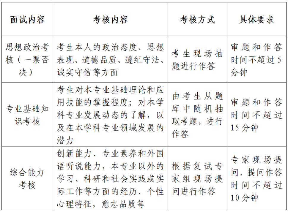 ③ 考核方式:复试采取百分制打分标准。思想政治考核不计入面试总成绩,考核不合格不予录取。复试成绩(100分)=专业基础知识考核(60分)+综合能力考核(40分)。