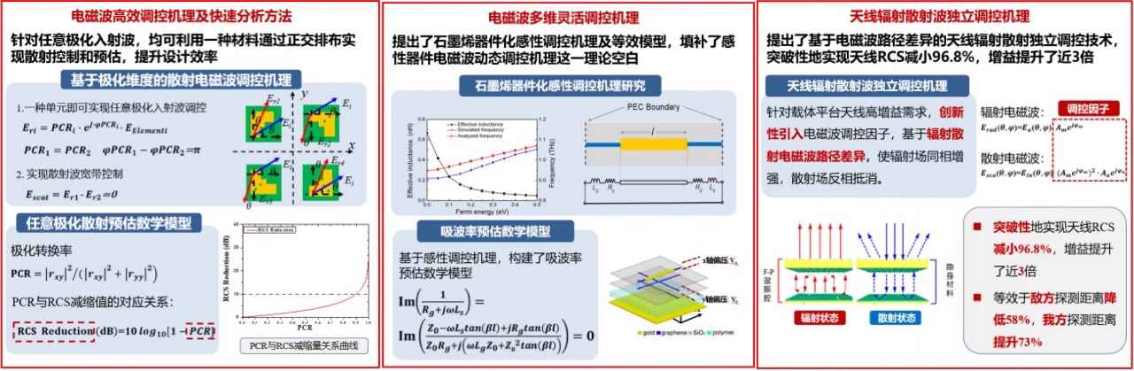 刘英教授牵头完成的“雷达低可见目标电磁特性分析与调控研究”项目,围绕雷达低可见目标散射高效分析与调控方法,提出了基于电磁功能材料的高增益、低散射天线设计方法。阐明了基于极化维度的目标电磁散射特性调控原理,提出利用极化调控结构实现目标电磁散射控制的方法,使雷达低可见目标设计复杂度降低1倍,解决了目标低散射设计效率低的难题;阐明了电磁功能材料对电磁波频率和极化的多维度连续调控机制,提出散射特性二维连续可调的多功能电磁材料设计方法,解决了目标散射特性调控维度单一且不灵活的难题;揭示了天线结构对电磁波辐射和散射的不同作用机理,利用辐射和散射电磁波路径差异实现天线散射降低的同时增益的提升,解决了天线低散射与高增益特性相互制约的瓶颈问题。