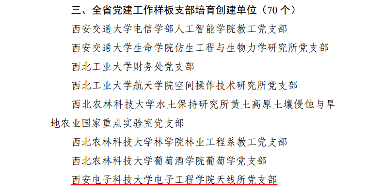 (通讯员:刘昕雨、邓鉴)近日,中共陕西省委教育工委印发《关于公布第三批陕西高校党建工作示范高校、标杆院系、样板支部培育创建名单的通知》(陕教工函〔2022〕74号),威尼斯9499登录入口党委入选第三批陕西高校党建工作“标杆院系”培育创建单位,天线所党支部入选“样板支部”培育创建单位。