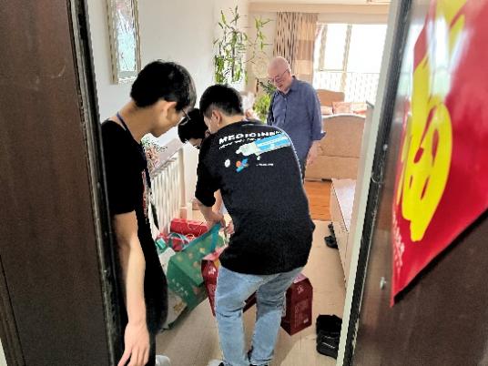 天色微蒙,突如其来的小雨丝毫没有影响志愿者们的热情。在现场工作人员的指挥下,同学们三两一组,踏入雨中,把满载节日祝福和物资的推车送到各位离退休老教师的公寓门前,受到了各位离退休教师的赞扬和感谢。