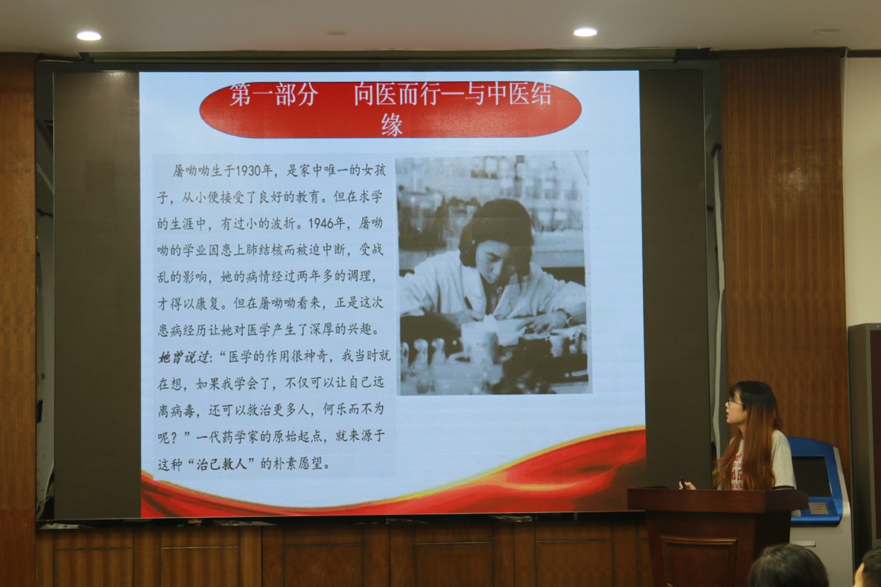 屠呦呦的父亲用《诗经》中“呦呦鹿鸣,食野之蒿”给她取名。这种奇妙的联系仿佛是一种预言。许多年后,因为这株叫“青蒿”的小草,屠呦呦打破了在自然科学领域中国本土科学家诺贝尔奖“零”的记录。丁苗同学说作为新时代的青年,我们应继承老一辈科技工作者执着坚守,无私奉献的精神。科学研究要耐得住寂寞和漫长的验证过程,需要不断努力奋斗,能在国内外期刊发表多少学术论文,并不是一个真正科研工作者追求的终极目标,只有树立起朴实的理念,才有可能取得真正的成果。