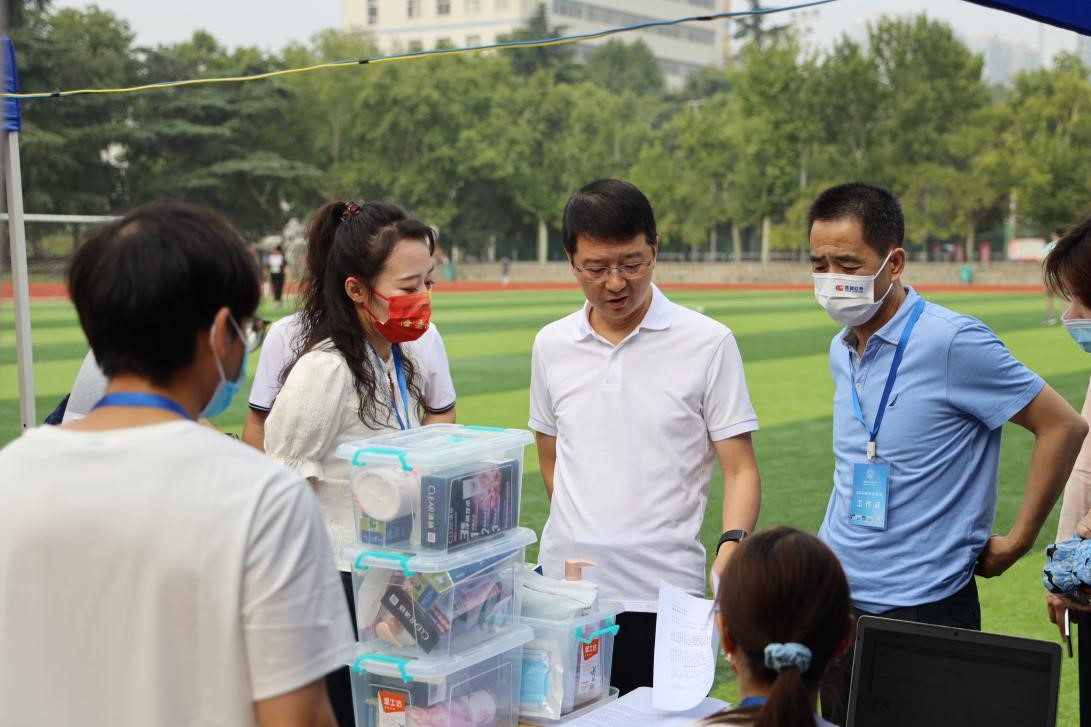 北校区体育场内,学院领导和迎新志愿者们早早布置好报到现场,认真地为每位新生办理证件核验、扫码注册、发放一卡通等环节,并送上学院精心准备的新生大礼包,提醒同学们认真落实静态管理各项要求。