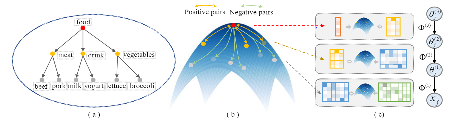 另一工作《HyperMiner: Topic Taxonomy Mining with Hyperbolic Embedding》同样由徐逸石和王东升合作完成。鉴于欧式空间在表达层次关系方面的基本限制,本文提出了一种基于双曲嵌入的知识表示方法。双曲空间是一种曲率为负常数的空间,拥有与树结构相类似的性质,因此在表示层次化数据方面有着天然的优势。本文提出的模型将单词和主题嵌入到同一双曲空间,利用双曲空间中特殊的距离度量来挖掘单词之间的语义层级关系,进而帮助模型发现数据中更加可解释的概念。此外,考虑到实际应用中先验知识对提升模型性能的重要性,本文进一步提出了一个基于对比学习思想的正则项,它可以有效地将外部结构化的知识注入模型当中从而引导模型挖掘出用户所感兴趣的概念关系图。模型的整体结构如下图所示。