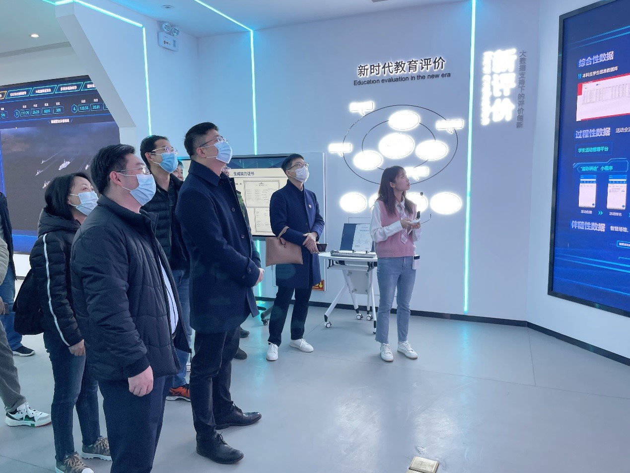 AI+教育中心讲解员带领大家参观各个展厅并进行详细讲解。展厅内容包括处处能学、时时可学的育人“新环境”,以类型重构和供给方式重构为主的“新资源”,以教学组织方式和教学流程重组再造的“新教学”,探索人机结合、人技结合的教师能力提升的“新培训”,以数据驱动探索大数据支持下的教育教学“新评价”,实现精准化、科学化、便捷化、智能化的“新治理”。展厅通过环境、资源、教学、培训、评价、治理等教育六要素的全新构建,为全校师生提供预警决策、数据支撑、协同运营、能力培训、资源制作等教育服务,探索智能时代高等教育新机制与新模式。