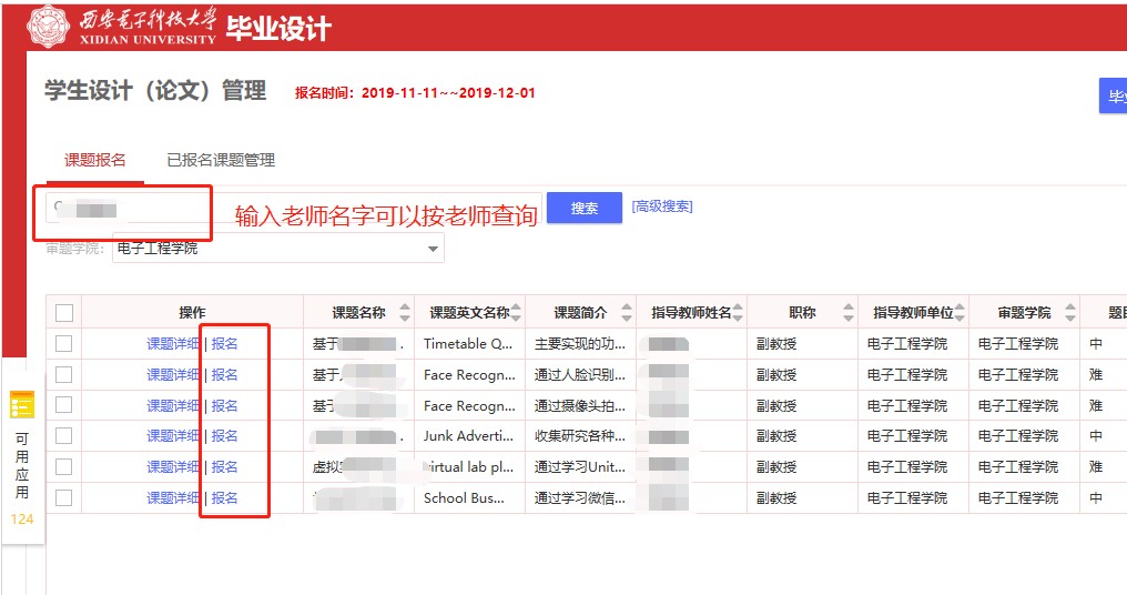 2022年11月22日至12月5日,学生登录学校一站式大厅教务系统(http://ehall.xidian.edu.cn)毕业设计模块(以下简称毕设系统)进行选题。