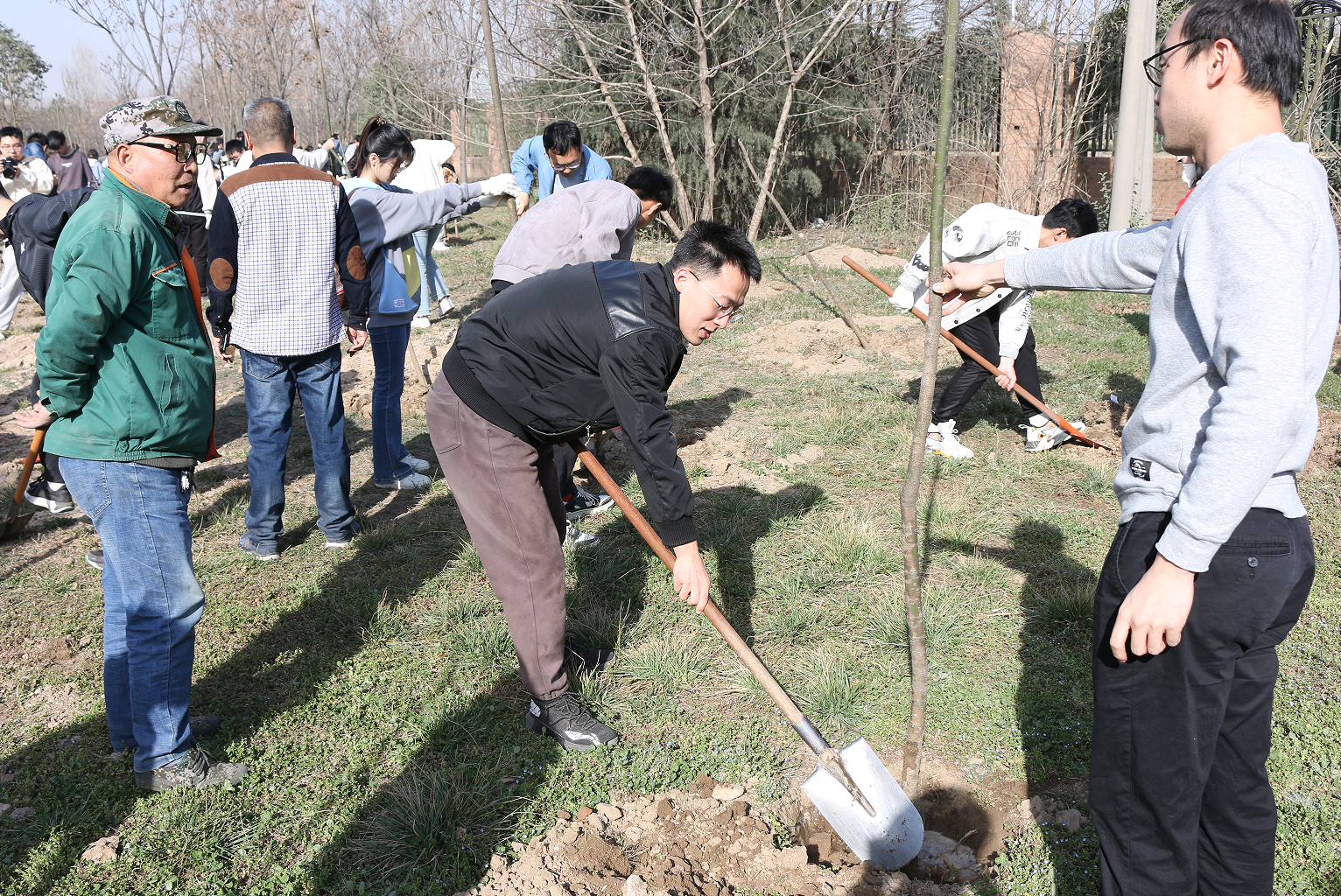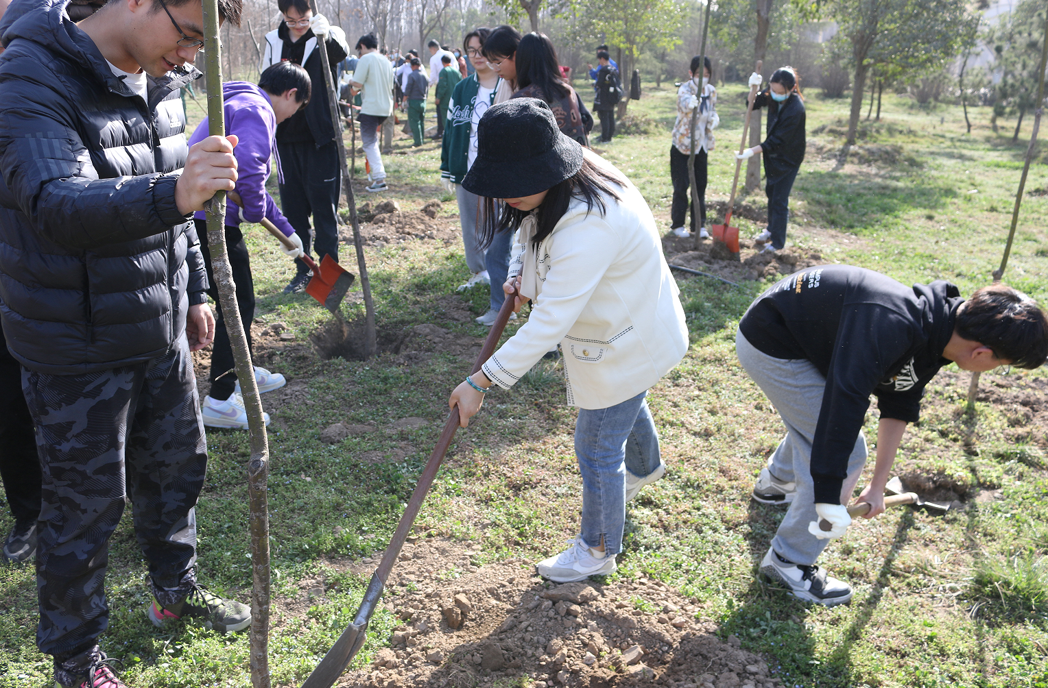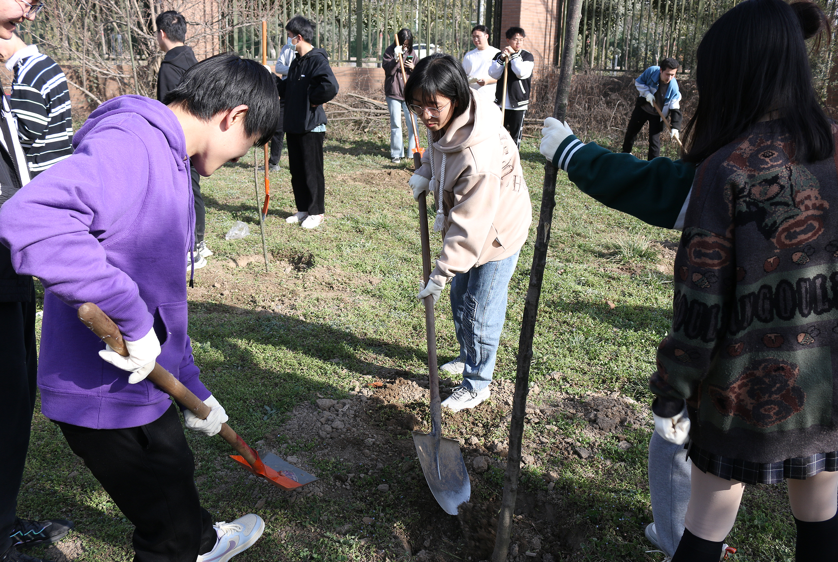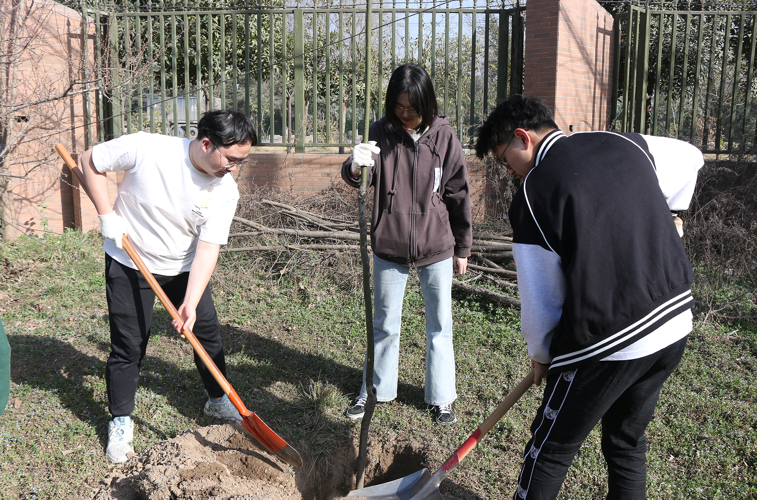 远望谷体育馆东侧,在后勤保障部园艺老师的统筹安排下,同学们三五人一组,有序分工,热情饱满。大家一起挥动铁锹、培植厚土、扶正新苗,让一棵棵树苗在灌溉之下萌发新生。同学们纷纷表示这次活动十分有意义,增强了自我植绿、爱绿、护绿的意识,在身体得到锻炼的同时,提高了自身的专业素养和动手能力。