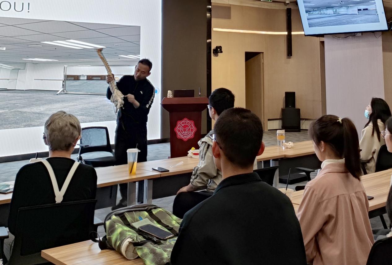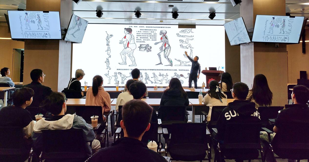 活动主要分为理论讲解和实践互动两个环节。活动伊始,王永刚老师结合现场同学们的诉求,从人体肌肉链的功能分配和作用机制角度切入,分析了久坐或运动后引起身体僵直酸痛的肌理原因,并结合教具模型和生活案例给出了对应的预防措施。王永刚强调,在日常生活和运动的过程中,不良习惯和错误的姿势会导致相应肌肉群的过度拉伸或收缩,因此要养成科学健康的体态以保持肌肉链的平衡。