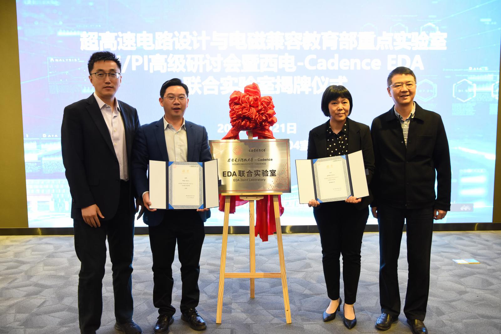 实验室副主任初秀琴向与会嘉宾简要介绍联合实验室的建设情况及发展规划。刘宏伟与顾鑫为西电-Cadence EDA联合实验室揭牌。杨光暐与顾鑫为联合实验室主任李龙、常务副主任初秀琴颁发聘书。