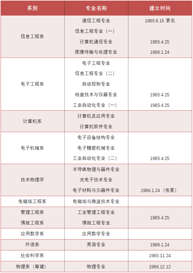 此时的专业设置,改变了以设备设专业的状况,开启了以学科设专业的新篇章。1979年成立电磁场工程系(六系),全校共设17个专业。截至1986年年底,全校共有10个系23个专业(物理系筹建中)。
