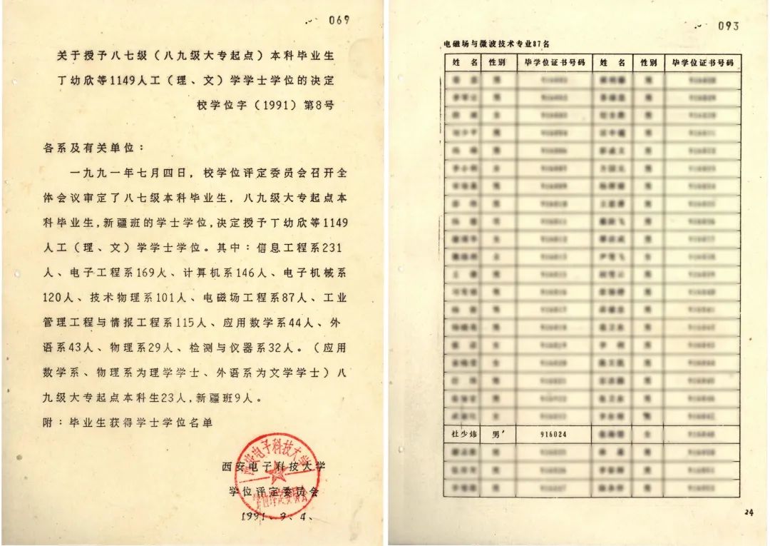 ▲关于授予八七级(八九级大专起点)本科毕业生丁幼欣等1149人工(理、文) 学学士学位的决定(西电档案馆馆藏)