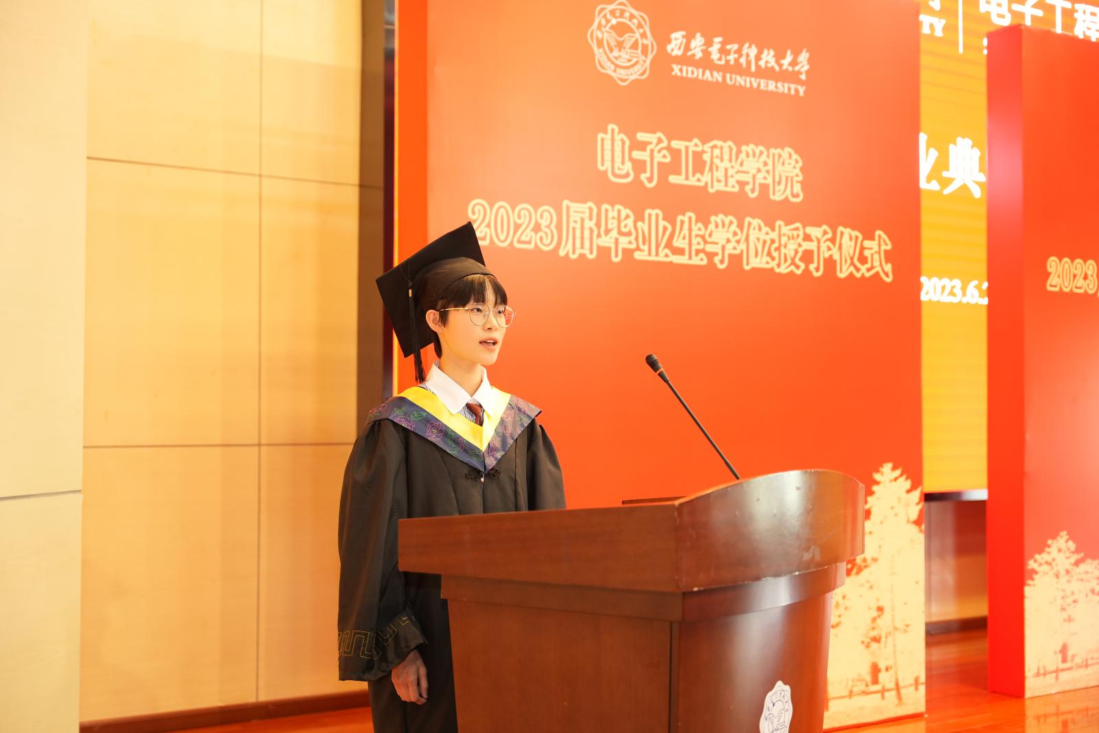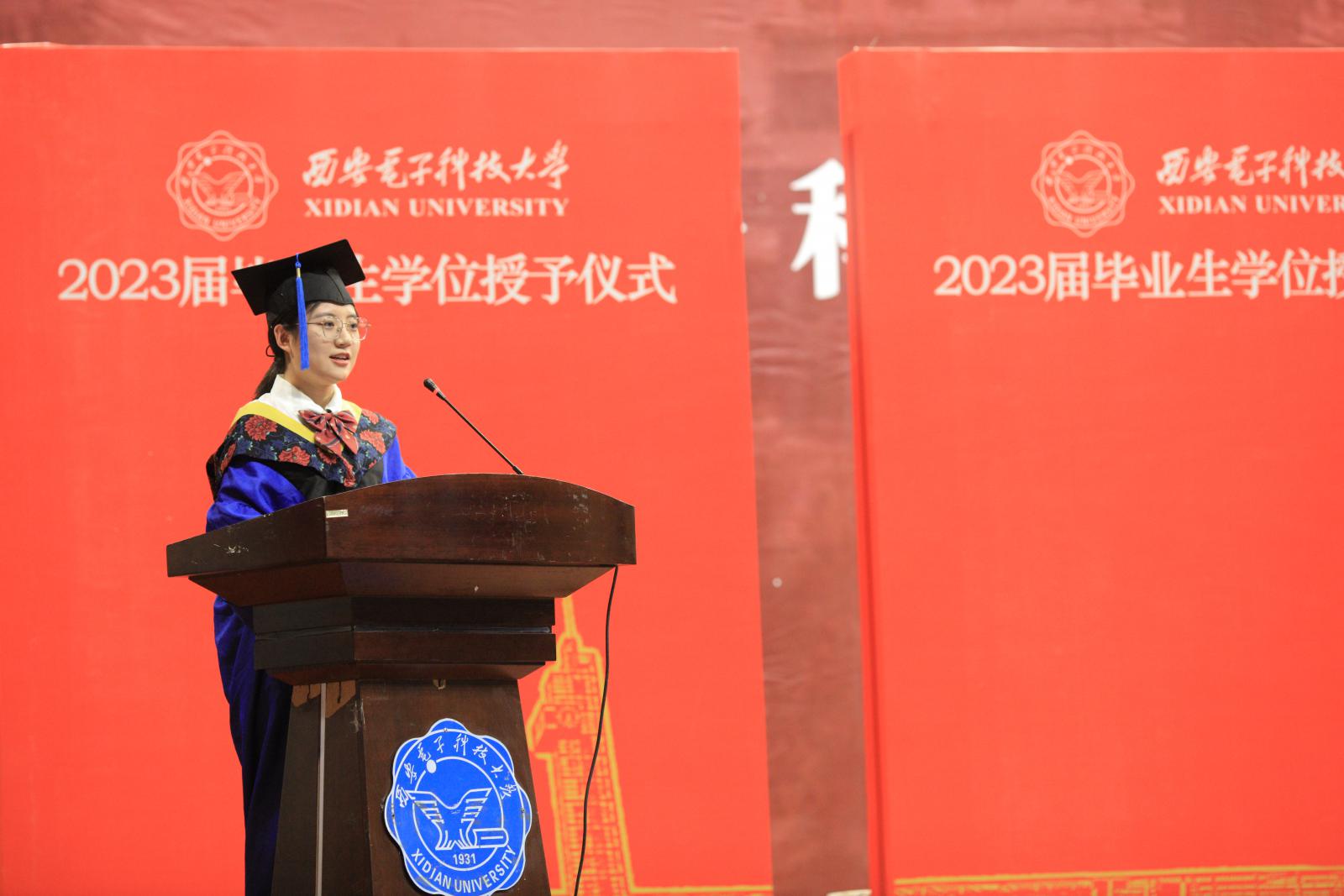 “我们成长的每一步都离不开母校和学院的培育,”硕士毕业生代表殷娇表示,“三年抗疫战斗,威尼斯师生凝心聚力、共克时艰,用责任担当谱写最美青春;迎接未来,科技报国的愿景将永远指引我们在强国复兴的征程上勇当‘信息尖兵,强国先锋’,我们2023届全体毕业生将承载新时代威尼斯人的荣光,以科研报国为己任,传承发扬红色基因,在未来的新征程中勇毅前行、锐意进取,用青春续写‘西电现象’,在时代中昂扬西电精神!”
