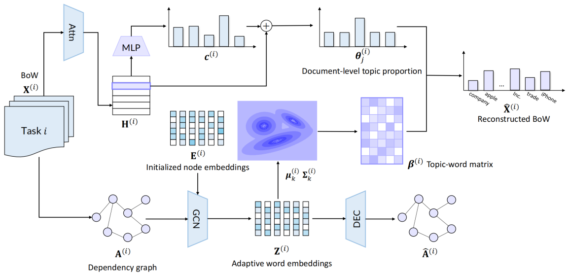 徐逸石与孙剑桥合作的《Context-guided Embedding Adaptation for Effective Topic Modeling in Low-Resource Regimes》延续了团队在认知深度概率模型的系列工作,该文针对资源不足条件下的主题建模提出了一种融合语境知识的框架。该框架的核心思想是通过整合当前任务的上下文信息来帮助生成自适应的词嵌入,其整体流程图如下图所示。具体而言,通过引入一个变分图自编码器对基于任务文档的语境提炼出的语法依赖图进行编码,可以学习到语义匹配当前任务的词嵌入。然后利用高斯混合模型对分布式的词嵌入进行建模,将每个混合分量视为一个主题的表示,该方法很自然地提供了一种聚类的视角来学习主题,这有助于尽可能地发现多样化的并且与当前任务紧密相关的主题。