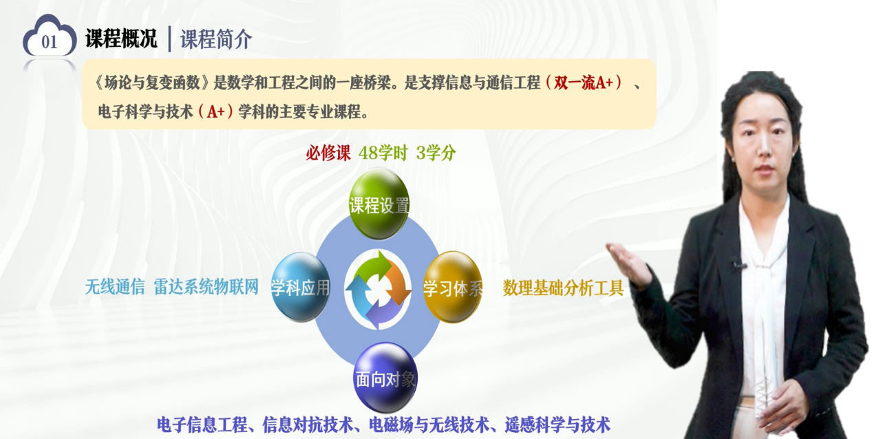李蕊老师团队讲授的《场论与复变函数》课程是支撑学校信息与通信工程、电子科学与技术等A+学科的大类基础课,搭建了数学和工程之间的桥梁。课程面向学校多个专业,旨在让学生掌握数理基础和分析工具,并应用于多个领域。课程坚持以工程应用为导向、以数学修养为主线开展教学,教学团队结构合理,由多名教授、副教授及讲师组成,通过国家级教学名师“传帮带”发挥示范引领作用,通过引入新的教学理念促进教学改革发展,通过系列教辅撰写推广成果。