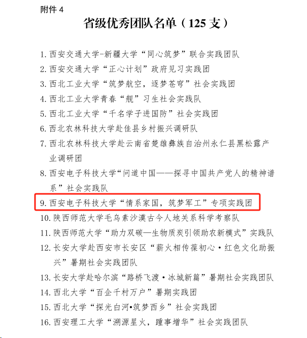 (通讯员 毕力格 杨笑宇)近日,由省委宣传部、省委文明办、省教工委、团省委、省学联等单位组织的 2023 年陕西省大中专学生志愿者暑期文化科技卫生“三下乡”社会实践活动先进集体评选结果揭晓,威尼斯9499登录入口“情系家国,筑梦军工”专项实践团获得省级优秀团队荣誉称号。