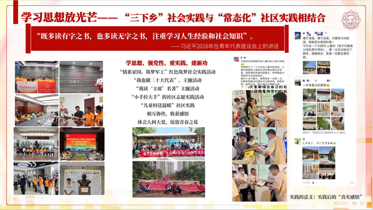 思想强、学习思想放光芒:“向党组织靠拢,行动践行红色理想”。班级积极将“三下乡”社会实践与“常态化”社区实践相结合,在寒暑假及课余时间,班级同学足迹遍布大江南北;支教偏远地区、宣扬红色文化,争做有理想、敢担当、能吃苦、肯奋斗的时代青年;开展系列实践活动,如“情系家国、筑梦军工”红色筑梦社会实践活动,“我也做二十大代表”、“我读‘主席’名著”等主题活动,“小手拉大手”、“儿童村送温暖”的社区志愿实践活动。同学们相互协作,收获感悟,体会人间大爱,绽放青春的实践之花。
