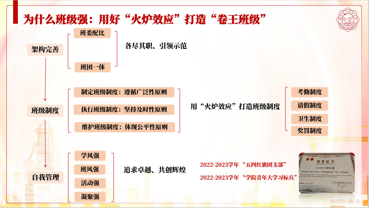 班级强、追求卓越创辉煌:积极用好“火炉效应”打造“卷王班级”。完善架构,班委各尽其职、引领示范;从遵循广泛性、坚持及时性、体现公平性三个原则制定班级制度;最终实现学生的自我管理,打造“学风强、班风强、活动强、凝聚强”的优良班风。上一学年获校级“五四红旗团支部”,院级“青年大学习标兵班级”。获优秀团干称号2人,优秀团员称号5人,优秀学生干部2人。