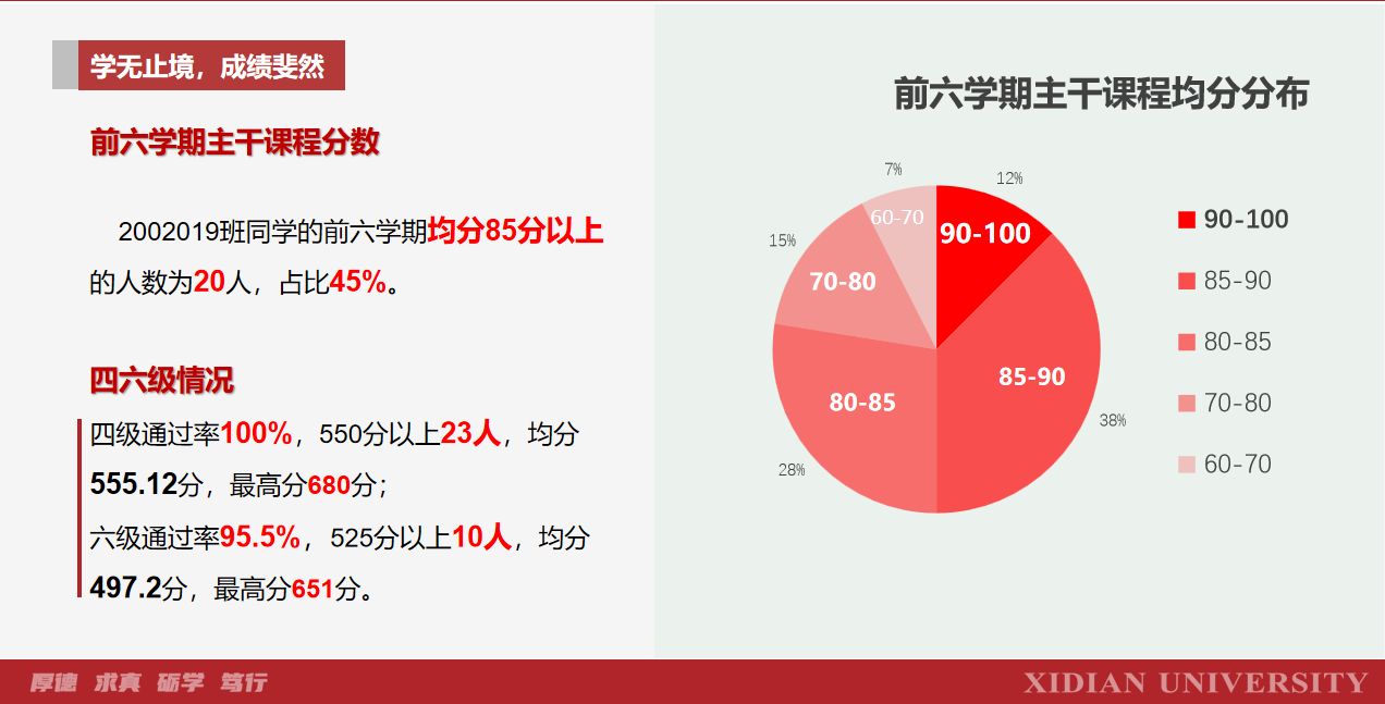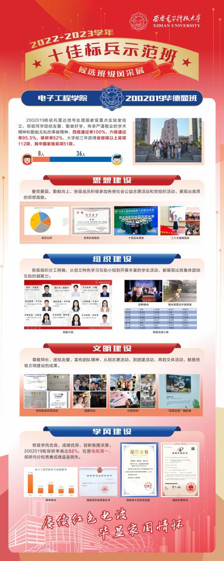 何恃而往,一苇以航。2002019班的同学们时刻牢记“厚德、求真、砺学、笃行”的西电校训,始终保持着勤学好问、进取向上的班级氛围。三年累计获得奖学金28万余元,人均超过7000元。他们在良性竞争中团结互助,共同进步。2002019班共保研23人,保研率达53%。他们前途似海,去往清华、北大、浙大、上交等名校,更有11名同学响应“毕德显班”人才培养宗旨的号召选择留在西电继续深造。
