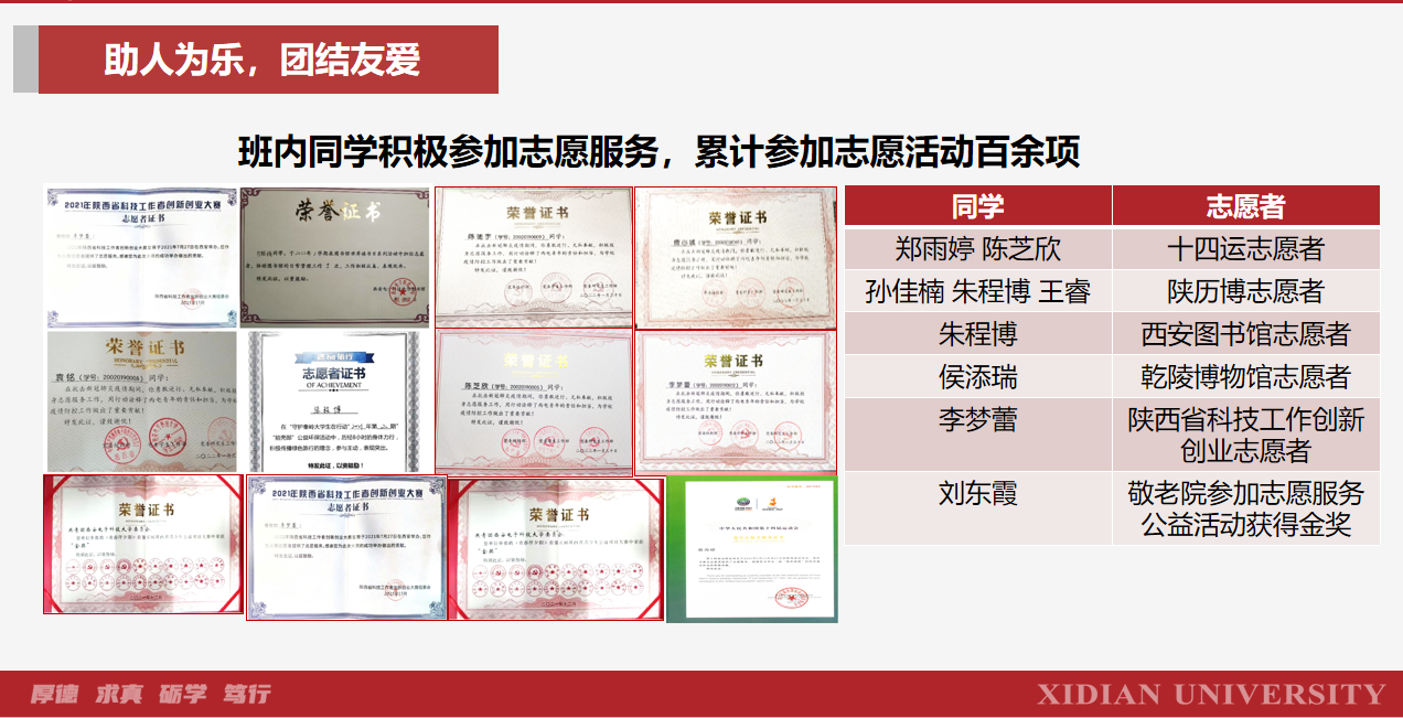 志在,愿在,我在,同学们的志愿活动随处都在。在志愿服务、暑期支教,无偿献血等现场上,都能看到同学们的身影,他们积极参加志愿服务,以奋斗诠释责任担当,用奉献书写不凡篇章。他们热爱艺术与生活,包容自由,才华横溢,在音乐、摄影、绘画、主持、辩论、演讲等方面百花齐放;他们注重培养良好的卫生生活习惯,获得9项先进宿舍的称号。同学有严格的纪律和高昂的斗志,在军训中获得了4项“军训优秀学员”的称号。