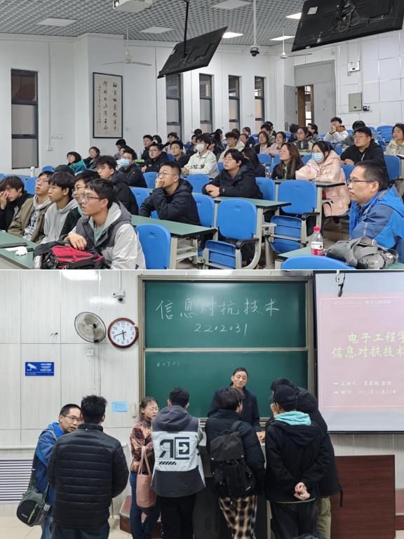11月24日下午,在2022级98名信息对抗技术专业的同学们热烈而期盼的掌声中,信息技术系主任、信息对抗技术国家一流专业负责人董春曦、电子信息与仿真技术教育部重点实验室副主任罗勇江和魏青副教授走进教学楼B208教室,与同学们开展了一场别开生面的见面会。