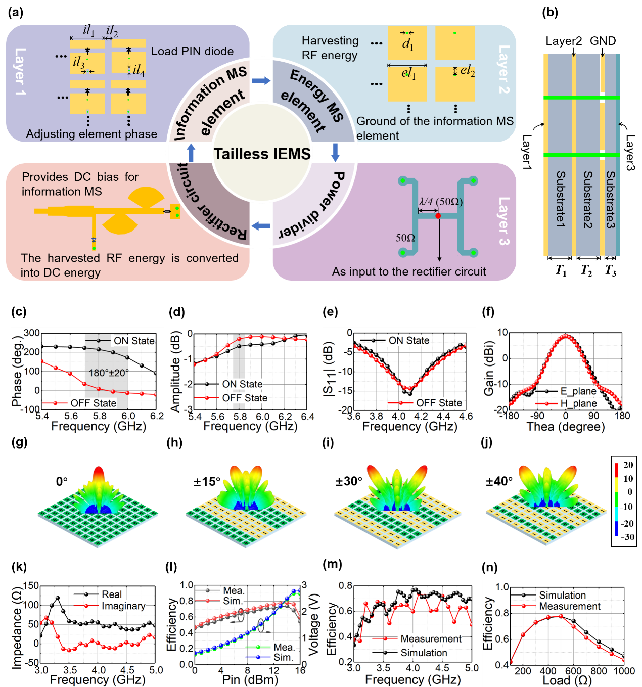该成果提出了一种全新的自驱动无尾信能超材料/超表面系统。可编程超表面因其集成了有源微波控制器件,如PIN二极管、变容二极管、MEMS开关或三极管等,可根据外部环境需求对电磁波和信息进行实时动态的调控,为新型电子信息系统提供了一种全新的范式,在5G/6G无线通信智能超表面(RIS)领域和新体制雷达相控阵领域具有重要的应用前景。但目前的可编程超表面需要外部的直流电源驱动,通过直流偏置网络才能实现对有源器件的控制,这根电源线就像尾巴一样,大大约束了可编程超表面的应用和部署,特别是在一些无人值守的区域、峡谷或山区等存在供电困难的特殊应用场景。