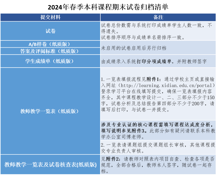 1.以上材料请于本学期提交(7月10日前),纸质版材料交至本科教学办公室(图书馆B区440室),电子版材料按照“学期(示例:2024春)+课程名称+任课教师”命名文件夹,发送至dybkjx@xidian.edu.cn。