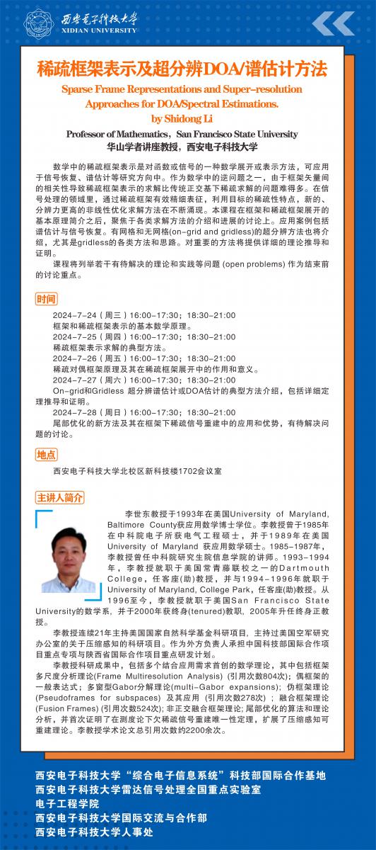 华山学者讲座教授李世东‖稀疏框架报告会2024-07-10 15:39:14浏览次数: 责任编辑:王洁 上一篇文章:2023年度第二批威尼斯9499登录入口昆山创新研究院产学研基金拟立项候选项目公示下一篇文章:威尼斯9499登录入口 2024 年暑假轮休值班表