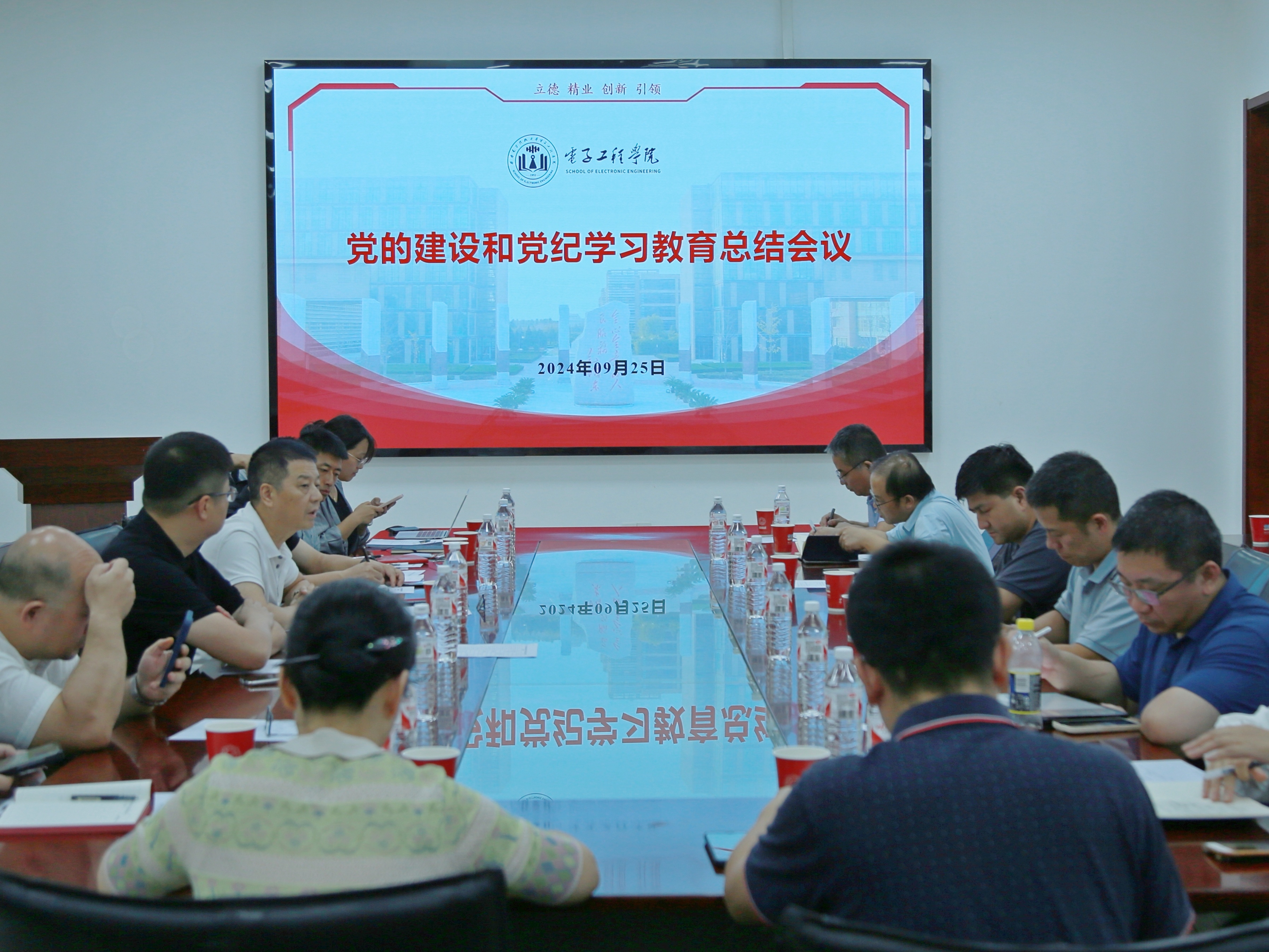 (通讯员 王洁 刘昕雨)9月25日下午,威尼斯9499登录入口党的建设和全面从严治党工作会议召开。会议传达学习习近平总书记近期重要讲话重要指示精神和中央党的建设工作领导小组会议精神,总结学院党纪学习教育情况,部署本学期学院党的建设和推进党纪学习教育常态化长效化工作。正处级组织员曹辉传达学校有关党建工作安排,党委副书记、纪委书记贺振航总结汇报学院党纪学习教育开展情况,天线所党支部书记刘英介绍全国党建“样板支部”建设的有关思考和工作进展情况。