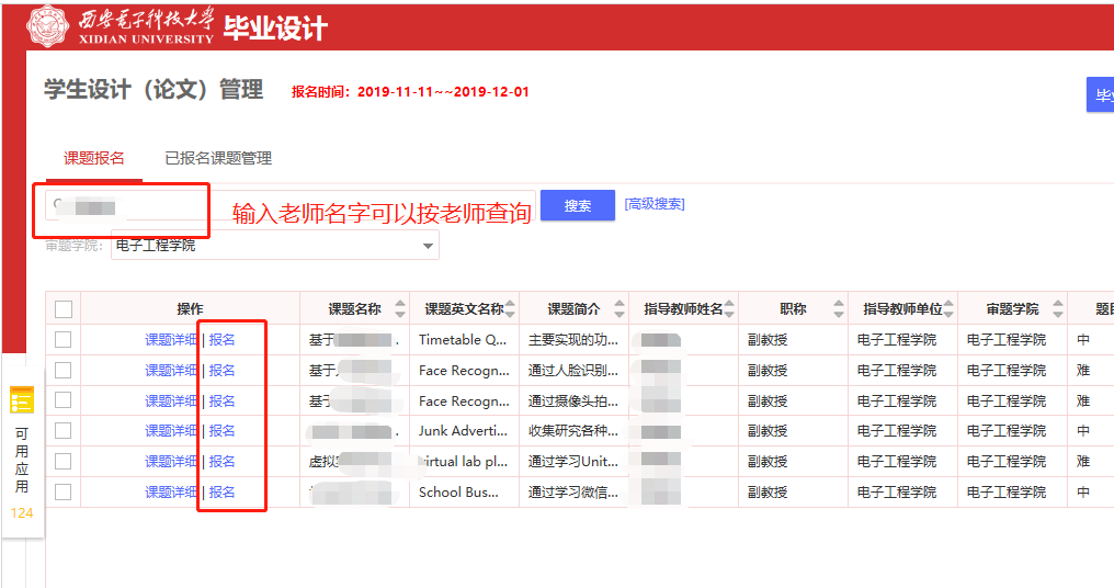 11月11日至11月21日,学生登录学校一站式网上办事大厅教务系统(http://ehall.xidian.edu.cn)毕业设计模块(以下简称毕设系统)进行选题。