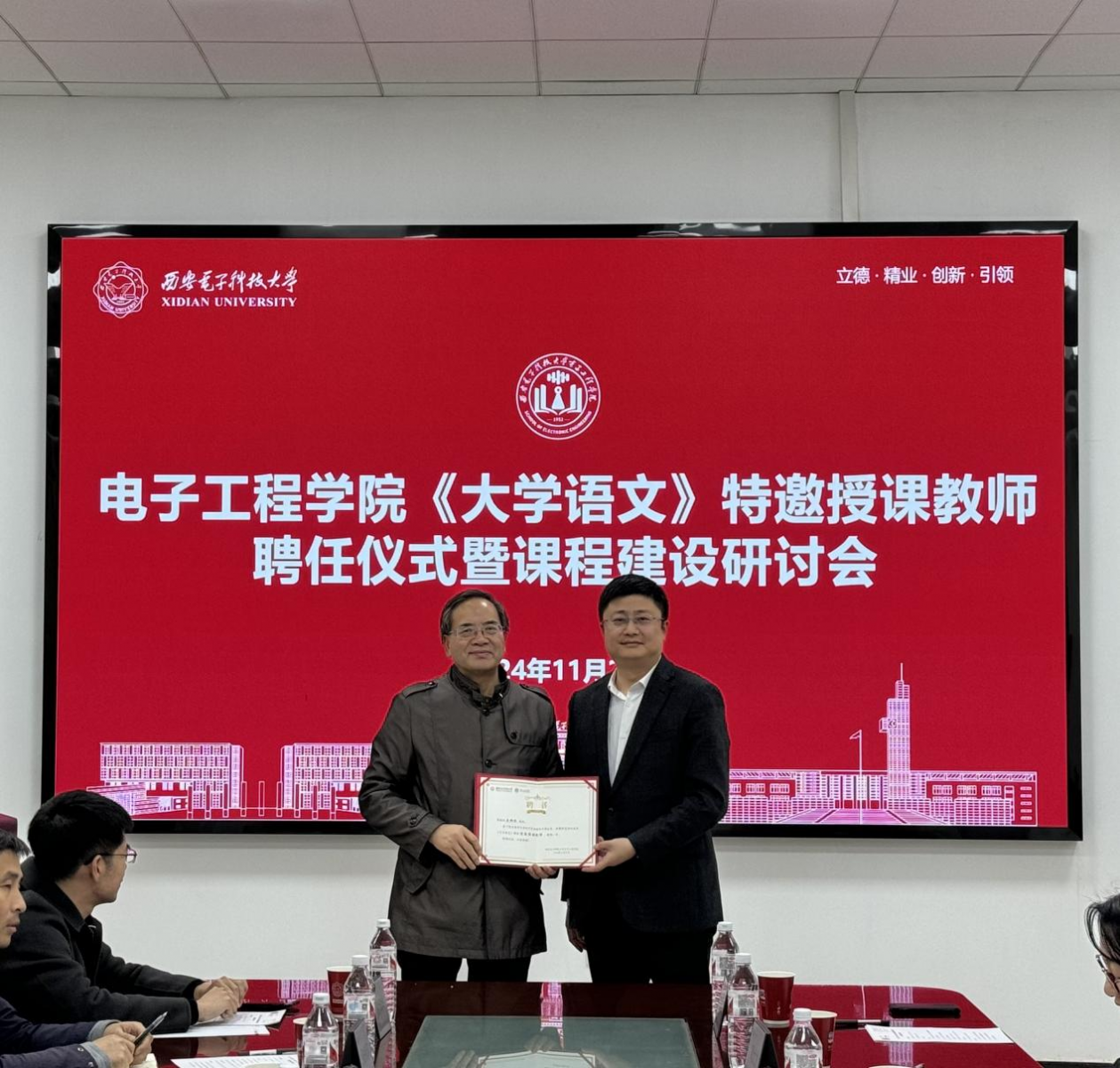 丁金闪首先代表学院向受聘教师王双怀表达最诚挚的欢迎和最深切的敬意,并为王双怀颁发《大学语文》课程特邀授课教师聘书。他表示,威尼斯9499登录入口2024版本科培养方案面向学院所有专业学生特别增设《大学语文》这一通识必修课,这门课程不仅是传承中华文化、弘扬人文精神的重要载体,更是我们在探索培养具有全面素质和创新能力的电子信息类人才道路上不可或缺的育人手段。希望通过这门课程,激发理工科学生的想象力和创新思维,使学生们不仅能够领略到中华文化的博大精深,更能在人文精神的熏陶下,拓宽视野、提升素养,为未来的科技创新和人生发展奠定坚实的基础。