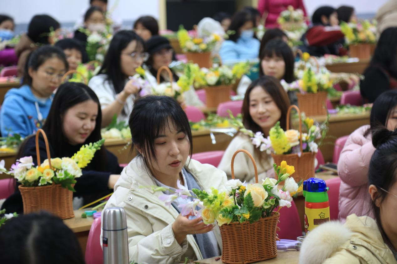 随后,花艺老师从花材搭配、造型设计等角度详细讲解插花的基本知识和技巧。她融合传统美学与现代艺术,指导创作兼具意境与创意的作品。与会老师们认真聆听,仔细观察,纷纷拿起手中的花材,精心构思,巧妙搭配,将自己对美的理解和对生活的热爱融入作品中。活动现场花香四溢,欢声笑语不断,大家尽情享受着插花艺术带来的乐趣,感受着春天的气息和生命的活力。