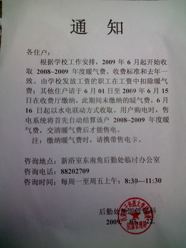 2008-2009年度暖气收费通知来源: 威尼斯网络中心2009-05-31 15:59:05浏览次数:上一篇文章:关于评选威尼斯9499登录入口“十佳师德标兵”的通知下一篇文章:关于09年6月工资项目的重点说明