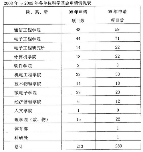 2009年度受理期我校共申请国家自然科学基金项目289项,比去年同期增长35%。其中面上项目141项,青年基金项目129项,联合资助项目3项,专项基金项目l项,重点项目8项、重大项目l项,杰出青年基金4项,海外及港澳学者合作研究基金项目l项,重大国际合作与交流项目1项。