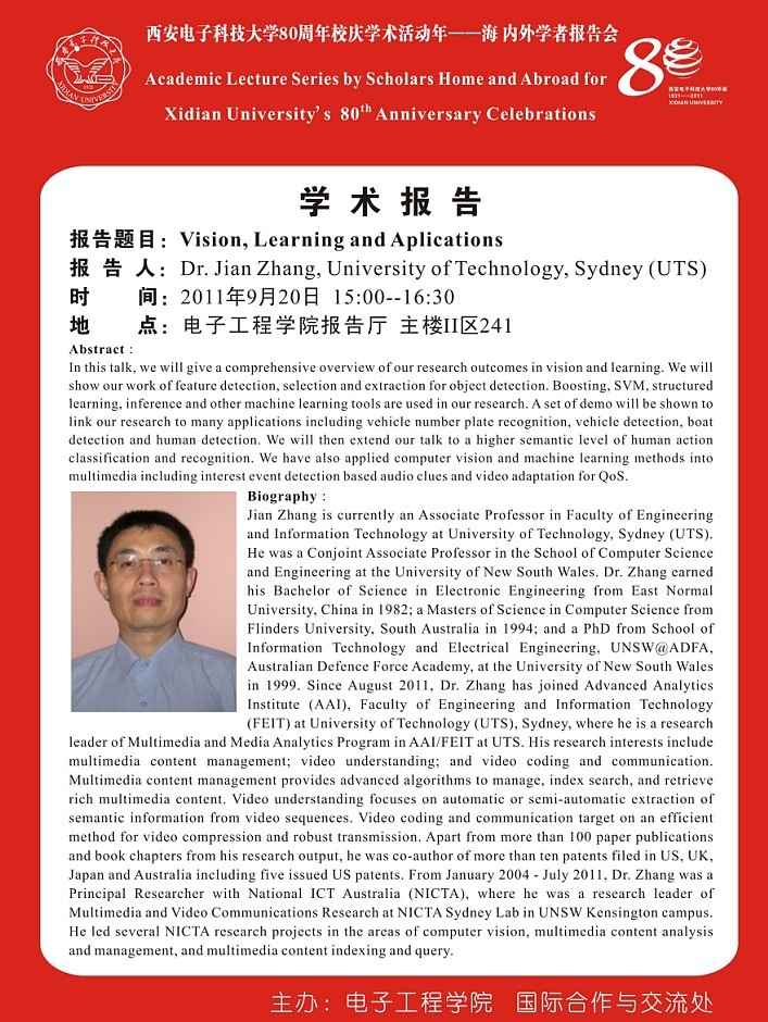 悉尼科技大学张建教授视觉学习学术报告会预告来源: 威尼斯网络中心2011-09-19 11:11:00浏览次数: 20日下午15:00,悉尼科技大学的张建教授为大家做一场题为:“Vision, learning and applications”的报告。地点:威尼斯9499登录入口报告厅,主楼II区241.上一篇文章:开通NoteFirst文献管理软件试用的通知下一篇文章:美国樊国良教授学术报告会预告