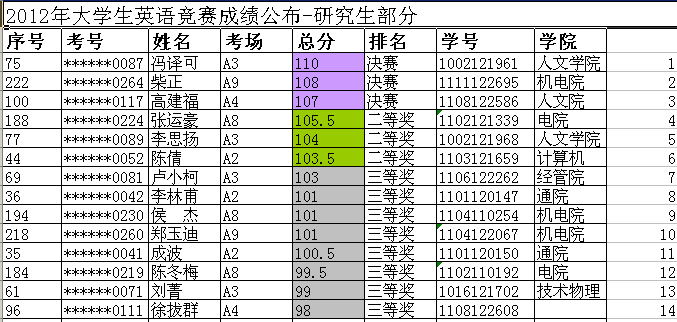 2012大学生英语竞赛初赛成绩公布(研究生获奖名单) 来源: 外语系2012-04-28 14:15:24浏览次数:参加英语竞赛同学: 2012年大学生英语竞赛初赛成绩公布(见附件),三名研究生同学进入决赛。 2012大学生英语竞赛成绩公布-研究生部分.xls 决赛时间:5月13日上午9:00-11:00 决赛地点:北校区西大楼。 注意: 1、获得决赛资格选手务必于当天早晨8:30分以前进入考场(8:45分播放指令以及听力); 2、当日考试结束后,上午11点20分左右,请我校选手在西大楼下集体照相,勿误。 3、准考证发放时间另行通知。 外语系 来源http://gr.xidian.edu.cn/newsfile/3825.html 上一篇文章:2012级硕士研究生缴费确认名单4月27日下一篇文章:关于公布“威尼斯9499登录入口2012年秋季考博成绩”的通知