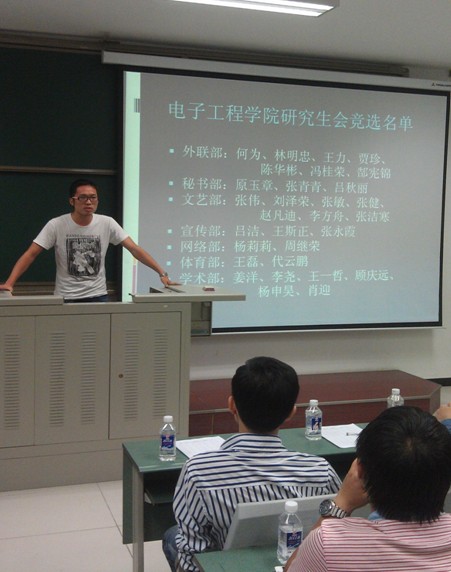 会议一开始,上届主席曲啸致开场辞,他先对研究生会上一年的工作进行了简要的回顾和总结,希望本届研究生会能继承上一届兢兢业业,刻苦耐劳的传统,在此基础上完善细节,更好的服务于学生,服务于校园。随后,本届主席高波进行了致辞。他对新同学的加入表示了欢迎,并对大家提出了竞选的要求,希望大家端正入会动机,并能够完美的表现自己,也说明了研究生会既是服务于广大同学的组织,也是磨练自我的舞台。