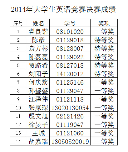 2014年大学生英语竞赛决赛成绩来源: 外国语学院2014-06-23 09:29:48浏览次数: 信息来源:外国语学院http://sfl.xidian.edu.cn/html/notice/2014/0620/191.html上一篇文章:威尼斯9499登录入口夏秋之约2014年毕业晚会纪念视频下一篇文章:威尼斯2014年本科毕业设计电子论文提交系统开放-截止6.26