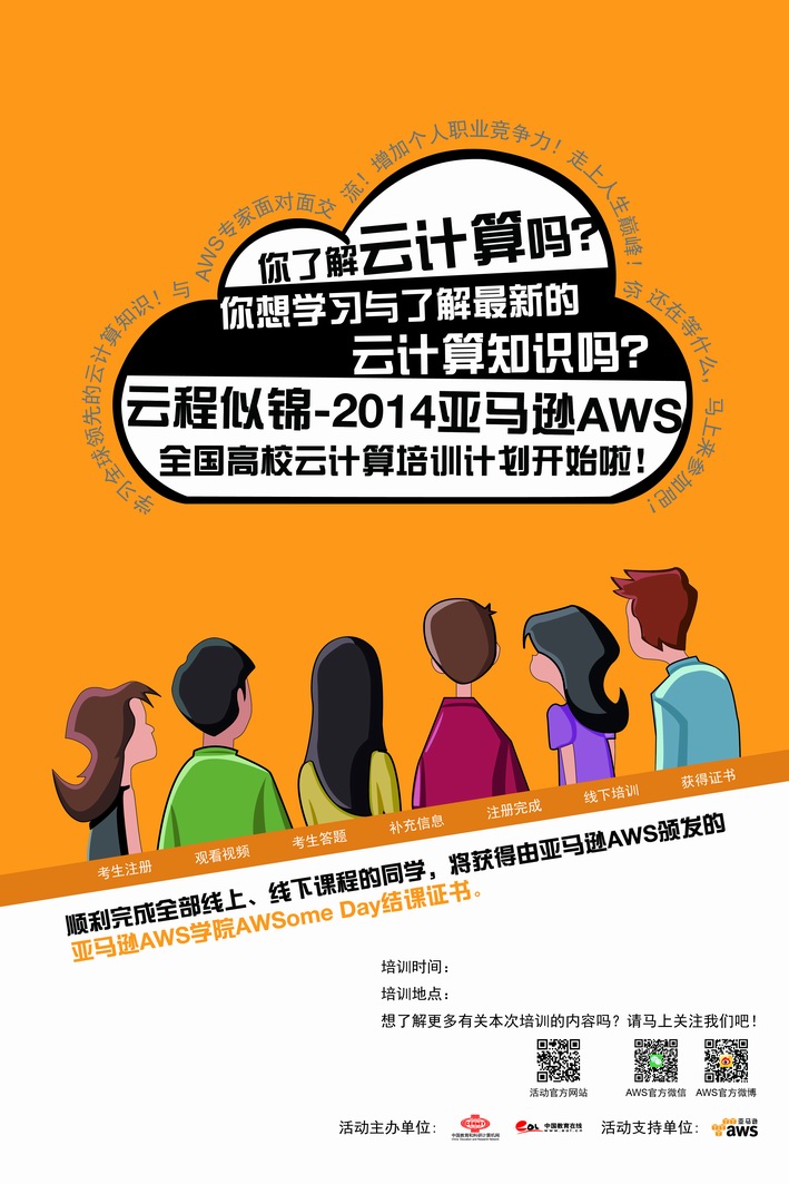 为了能够更加有效地培育和储备科技创新人才,帮助大学生充分掌握最先进的IT技术,在严峻的就业形势面前更具竞争力,最终实现顺利就业,由中国教育和科研计算机网、中国教育在线特联合全球知名IT企业亚马逊公司面向全国大学生的“云程似锦——2014亚马逊AWS全国高校云计算培训计划”正式登陆西电。活动时间为10月16日晚18:30至21:30,地点为大活小剧场。届时,将由亚马逊公司的著名讲师为大家讲解关于云计算方面的知识。具体情况如下: