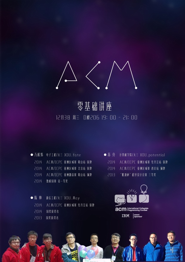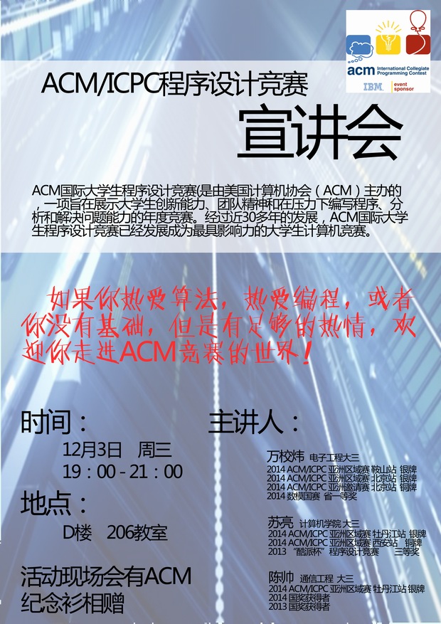 # ACM零基础讲座 # 12月3日(本周三)D楼206 19:00-21:00,由刚刚征战完亚洲区域赛的西电ACM基地的大神带来ACM零基础讲座。讲座会介绍ACM竞赛入门,保研,工作等内容。如果你不想只是一个“单纯”的学霸,如果你不想只是一个“简单”的码农,如果你想让自己变得更有竞争力,如果你热爱编程,喜欢思考,吃苦耐劳,如果… 那么请你加入我们,成为一名ACMer,与全世界的ACMer争锋天下!(Ps:讲座现场还会有ACM纪念服和小礼品相送)