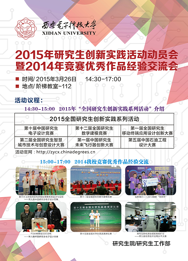 为提升研究生创新实践能力,推动研究生培养模式改革,学校决定组织广大研究生参加由教育部学位与研究生教育发展中心、中国科协青少年科技中心发起的2015年“全国研究生创新实践系列活动”。作为系列活动的启动仪式,研究生院决定于3月26日下午2点30分于北校区阶梯教室112召开“威尼斯9499登录入口2015年研究生创新实践活动动员会暨2014年竞赛优秀作品经验交流会”。届时,将向大家介绍2015年研究生创新实践活动六大赛事的具体情况,并由 2014年度竞赛获奖优秀队伍介绍参赛经验。