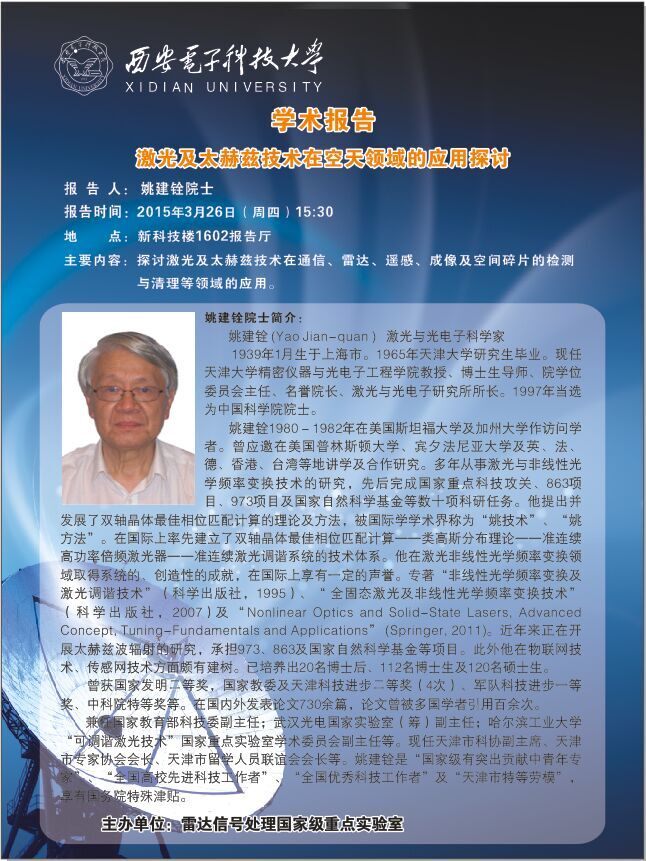 激光与光电子科学家姚建铨院士来雷达信号处理国家级重点实验室讲学访问