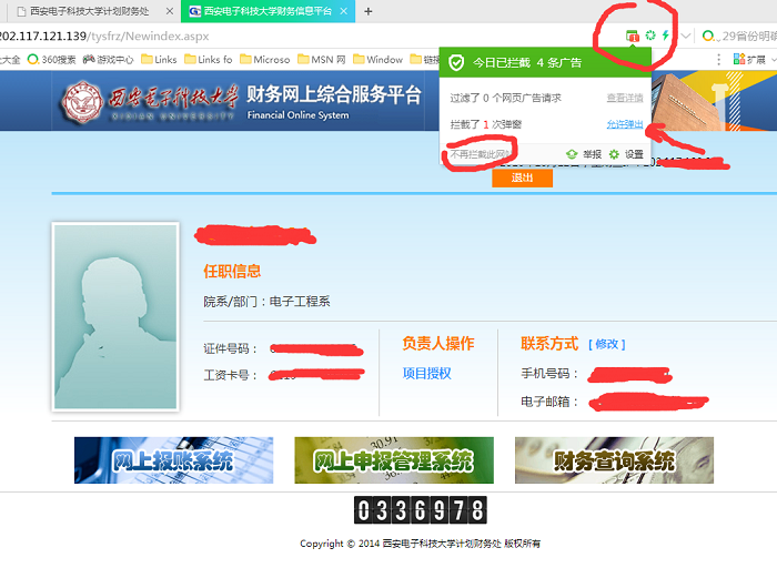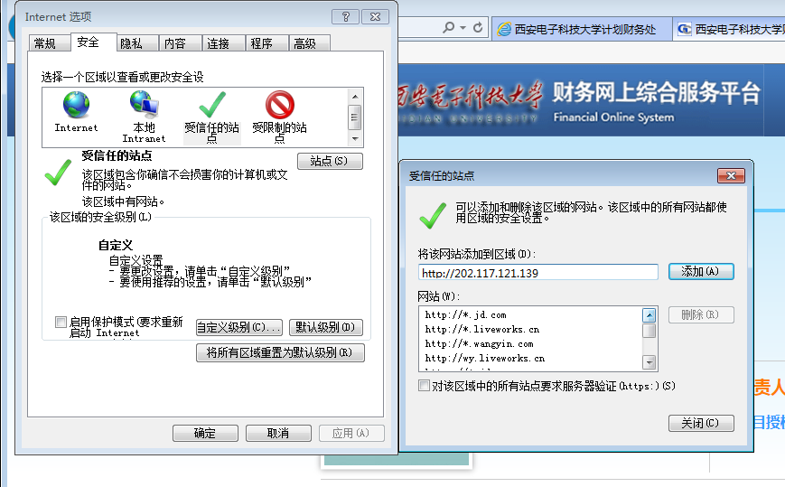 有老师反馈 通过IE浏览器访问学校财务处查询系统,总是无法点开查询功能,原因主要是查询链接是一个弹出式窗口,点击之后浏览器会进行拦截,所以请照以下操作,把财务处查询系统的IP 202.117.121.139 加入到IE浏览器可以信任站点里里面。具体操作如下。