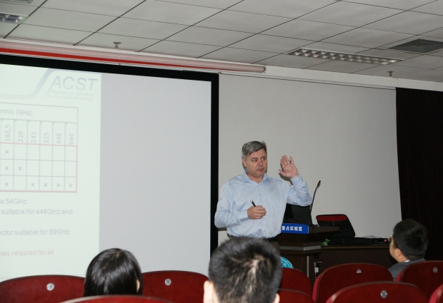 报告以丰富的图片和精确的实验测试数据详细阐述了当前太赫兹波固态产生技术的主流方法,即基于薄膜二极管(Film-Diode)芯片的倍频技术,并介绍了ACST领先的相关芯片测试以及封装技术。报告具体涉及到太赫兹倍频技术、谐波混频技术、低噪放、太赫兹集成电路设计等方面。据介绍,欧洲第一部664GHz固态接收机系统即由ACST作为核心芯片提供者参与完成。报告最后介绍了ACST参与的重大项目,如欧洲空间局的EUMETSAT项目等,引起参会师生的极大兴趣。
