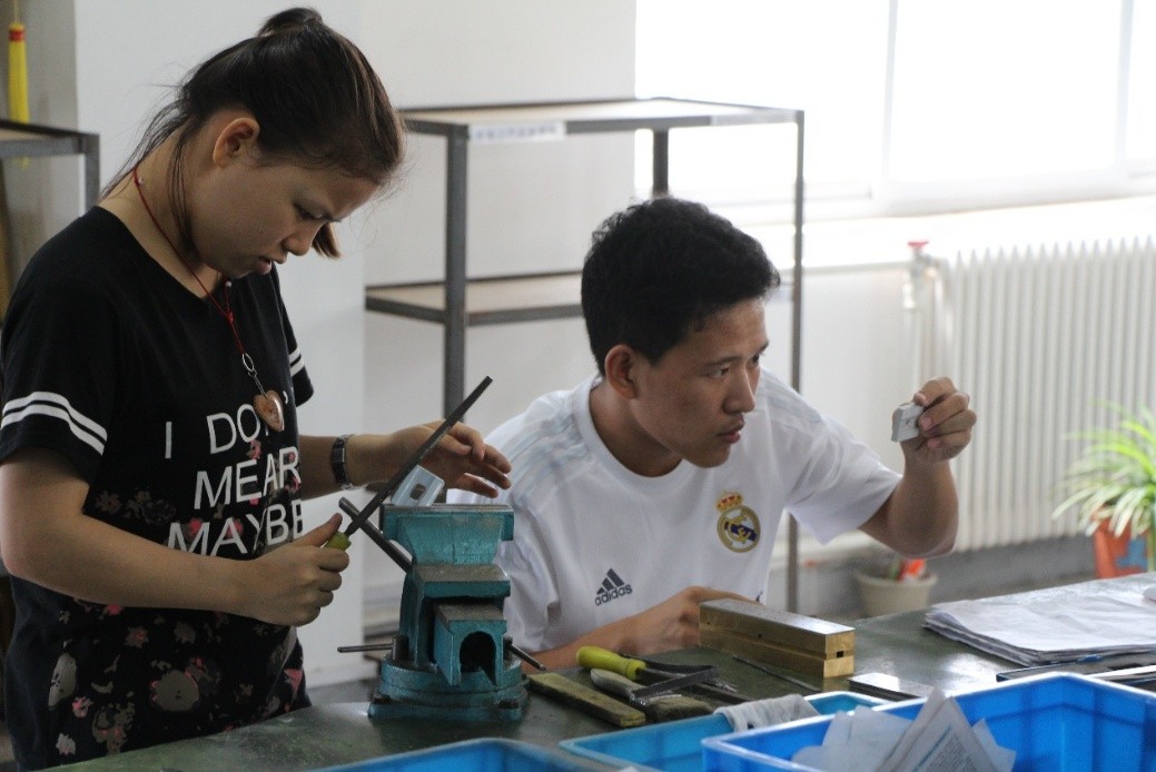与此同时,学生们也学习了从原材料到成品批量生产的全过程以及生产组织管理等知识,培养了学生树立理论联系实际的工作作风,学生们也亲身体验了钳工的相关环节。一个个“小技工”们聚精会神,对零件的表面进行打磨处理,保证粗糙度控制在要求范围内,这都是机器代替不了的。