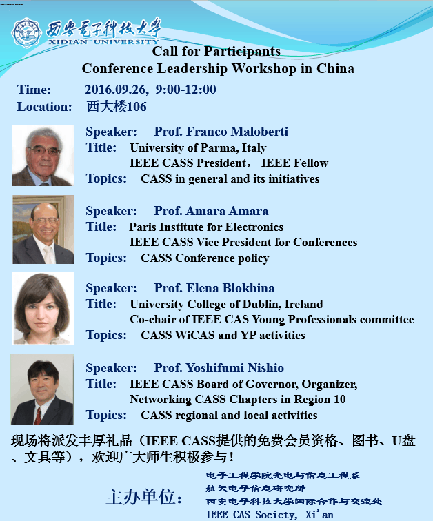 IEEE CASS学术研讨会2016-09-25 17:48:20浏览次数: 讲座名称:Call for Participants Conference Leadership Workshop in China 讲座时间:2016.9.26,9:00-12:00 讲座地点:西大楼I-106 上一篇文章:瑞典隆德大学刘本健教授来校开展学术交流下一篇文章:新南威尔士大学学者贾秀萍来访